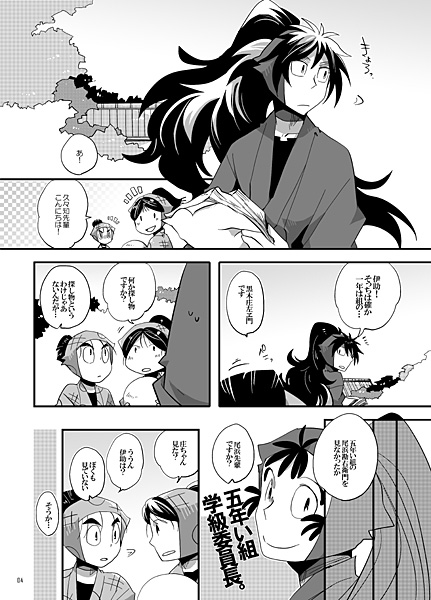 久々知くんの相談癖から逃げ回る尾浜くんと、 巻き込まれる三郎+その他の人々。 その他の人々は、庄左ヱ門、伊助、木下先生がちょこっとと、 土井先生、雷蔵、八左ヱ門が4コマにうろうろと登場するくらいです。 健全/CP要素はありません。